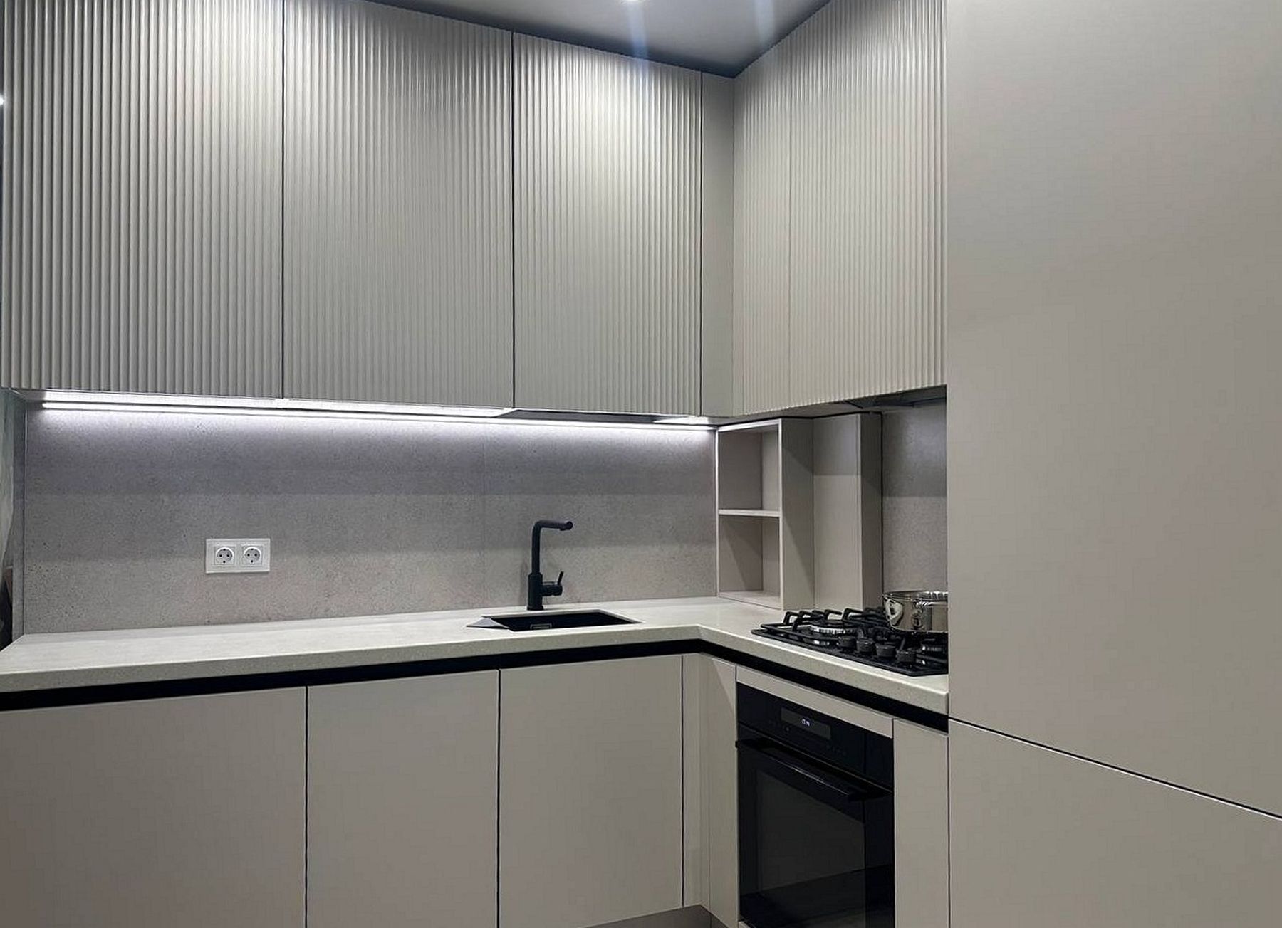 Светлая кухня с черными акцентами и интегрированной мойкой